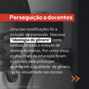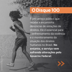 Criado em 1997 como iniciativa de organizações da sociedade civil, o Disque 100 é um serviço público vinculado ao Ministério da Mulher, Família e Direitos Humanos (MMFDH) que tem a função de receber, analisar e encaminhar denúncias de violações de direitos. Além disso, a sistematização das denúncias recebidas é um instrumento para que gestores públicos, sociedade civil e pesquisadores possam monitorar a situação dos direitos humanos no país. No entanto, o canal foi reformulado no governo Bolsonaro. Uma das mudanças foi a inclusão da expressão “ideologia de gênero” como motivação para violação de direitos humanos, como forma de estimular denúncias contra profissionais de educação que abordem a questão nas escolas.