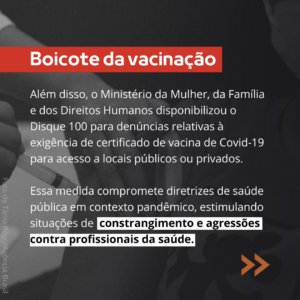 O MMFDH também editou uma nota técnica em que afirma ser uma violação de direitos humanos a exigência de comprovante de vacina para acesso a locais públicos ou privados. O Disque 100 foi disponibilizado para recebimento desse tipo de denúncias, em mais uma ação de combate às medidas de contenção da pandemia de Covid-19. Mais uma vez, a instrumentalização do Disque 100 desrespeita decisão do Supremo, que afirmou a legalidade de restrições indiretas para ampliação da cobertura vacinal no país.