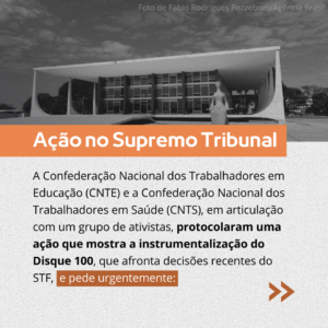 “Conceitos de direitos humanos vêm sendo subvertidos de forma a permitir a execução de uma política de vigilância, perseguição, discriminação e repressão, sobretudo nos campos da Educação e da Saúde”. É o que afirma uma ação no Supremo Tribunal Federal (STF), protocolada nesta terça-feira (8) pela Confederação Nacional dos Trabalhadores em Educação (CNTE) e pela Confederação Nacional dos Trabalhadores em Saúde (CNTS) em articulação com ativistas e operadores de direito que atuam na defesa dos direitos humanos.
