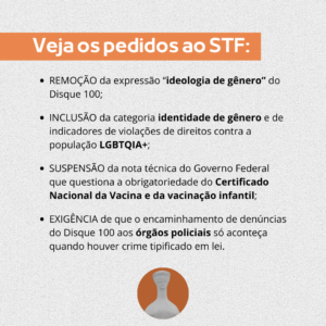 As proponentes da ADPF solicitam que o STF urgentemente determine a remoção da expressão “ideologia de gênero” do Manual de Taxonomia de Direitos Humanos e do Painel de Dados do Disque 100; a inclusão da categoria identidade de gênero e de indicadores de violações de direitos contra a população LGBTQIA+; a suspensão da nota técnica do MMFDH que questiona a obrigatoriedade do Certificado Nacional da Vacina e da vacinação infantil; e a exigência de que o encaminhamento de denúncias do Disque 100 aos órgãos policiais só aconteça na hipótese de crime tipificado em lei, constando o tipo penal específico.