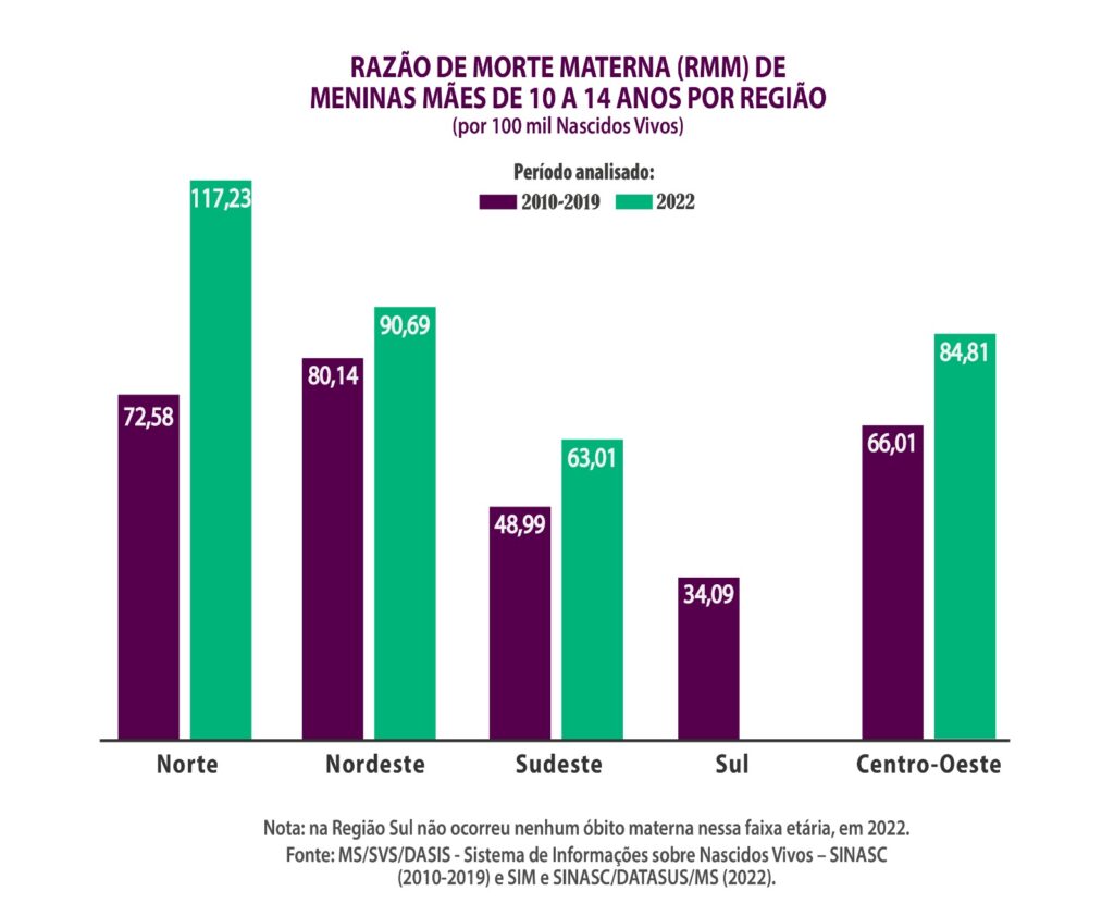 A Rede Feminista de Saúde divulga o estudo “Estupro de Vulnerável: Caracterização de Crianças Mães no Brasil em 2022” uma atualização do estudo original realizado em 2021 referente ao decênio 2010-2019. Considerando os casos como estupro de vulnerável, a pesquisa tem como objetivo analisar indicadores da saúde de meninas de 10 a 14 anos, como a Razão de Mortalidade Materna e a Taxa de Natalidade. O estudo sobre meninas mães no Brasil em 2022 revela dados importantes: houve uma queda nas gestações entre meninas de 10 a 14 anos, mas as desigualdades regionais e étnicas ainda são preocupantes. A mortalidade materna entre essas meninas é muito alta, e a maioria são negras e indígenas, das regiões Norte e Nordeste, como mostra o infográfico: